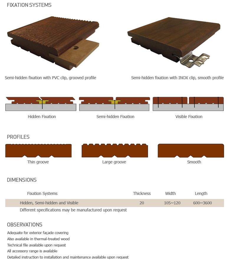 Manufactured from high mechanical resistance, density and durability wood species, it is ideal for areas surrounding swimming pools and gardens, yards, balconies, terraces for bars and restaurants, footways accessing anchorage ground or marinas.
