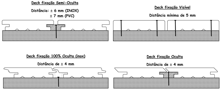 - Para um melhor comportamento em serviço, as fixações ocultas só são aconselháveis nas madeiras de Ipê e Teka.